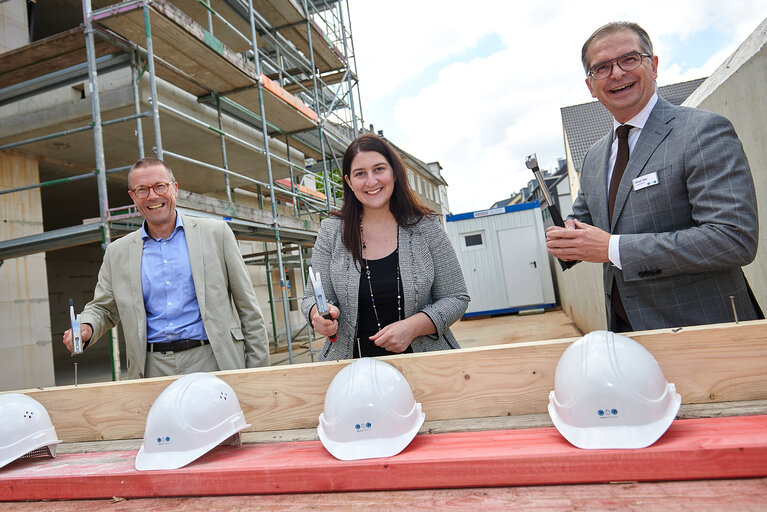 Auf dem Gelände der ehemaligen Bremme-Brauerei in Barmen nimmt das erste GWG-Bauprojekt seit mehr als 20 Jahren Formen an: Auf der Baustelle Untere Lichtenplatzer Straße ist heute Richtfest gefeiert worden. Bis Spätsommer 2022 entstehen dort 30 barrierearme Mietwohnungen - darunter sogar eine rollstuhlgerechte - sowie eine Kindertagesstätte für vier Gruppen. Die GWG investiert insgesamt rund 13 Mio. Euro in das Neubauprojekt. Die Bauarbeiten hatten am 31. März 2020 begonnen.